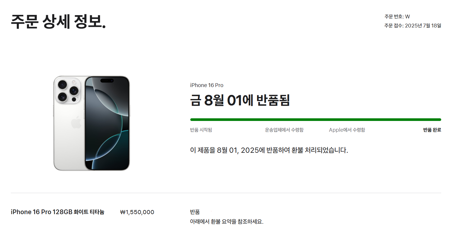 2025년 7월, Apple 공식 홈페이지에서 구입한 아이폰 16프로(128GB)를 용량 부족 사유로 Apple 여의도 매장에서 반품·전액환불 받았다.