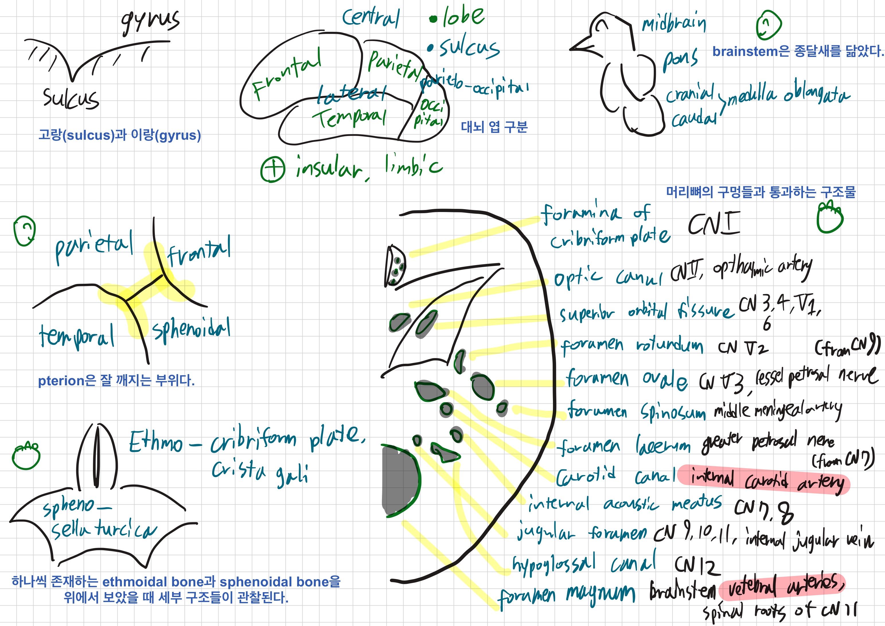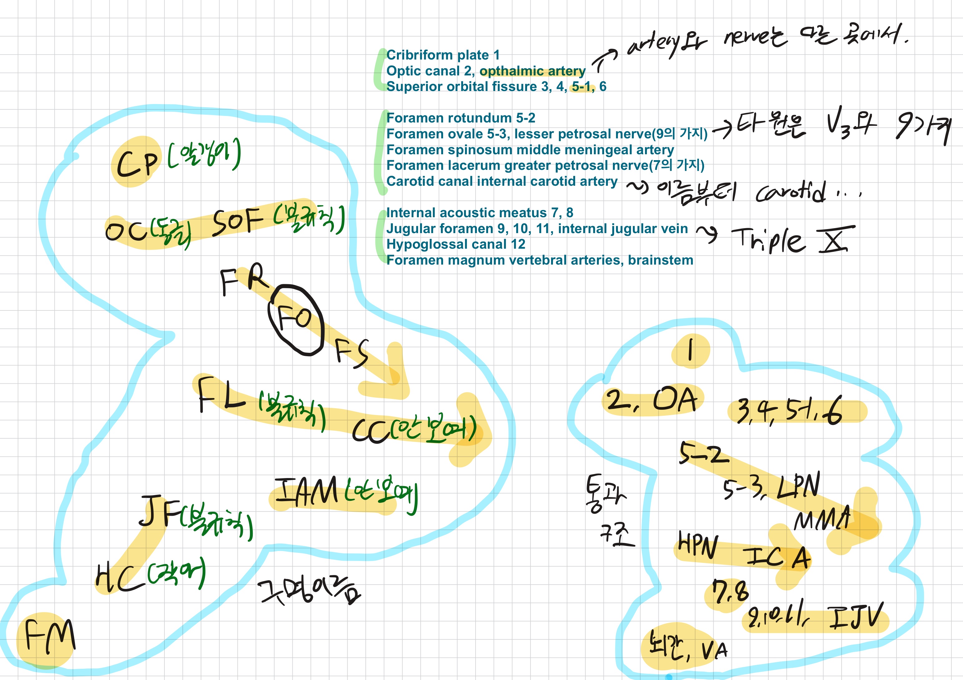 * foramen of skull에서 각각의 구멍과 통과하는 구조물들을 모두 숙지해두어야 한다.