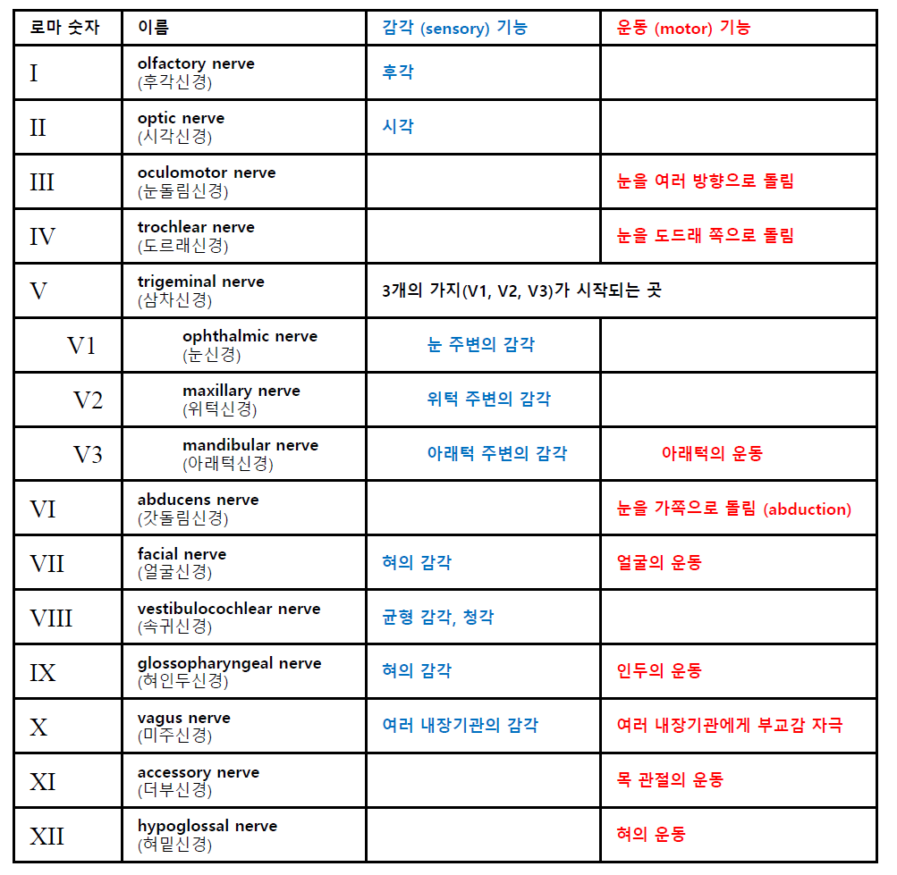 뇌신경 12쌍의 이름과 기능