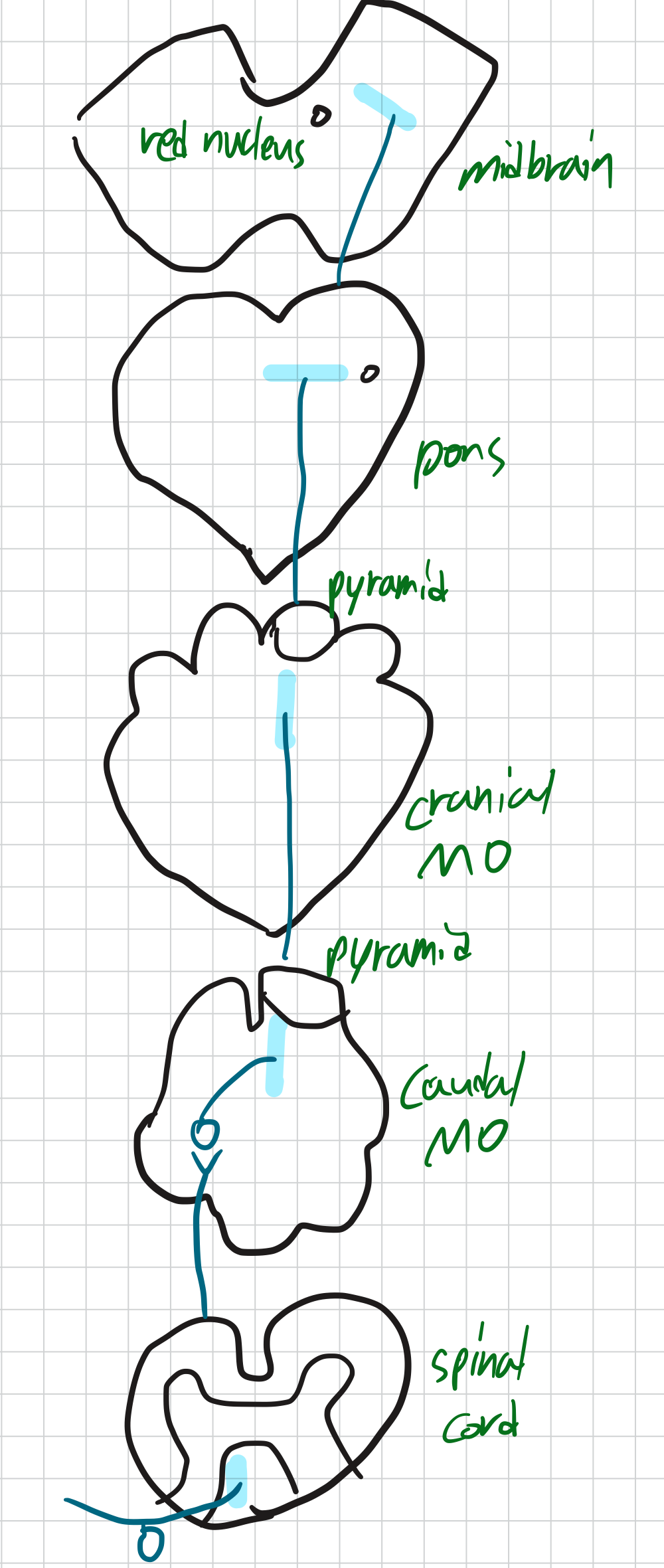 - MO에서 pyramid를 지나고, brainstem 최하단에서 pyramidal decussation을 한다.