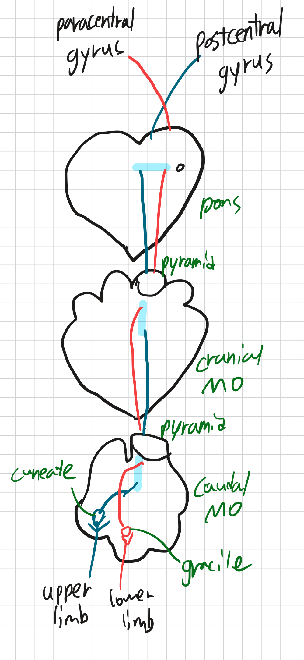 - caudal MO에 cuneate and gracile nucleus가 있다고 했는데, upper limb는 cuneate에서 시냅스한다.