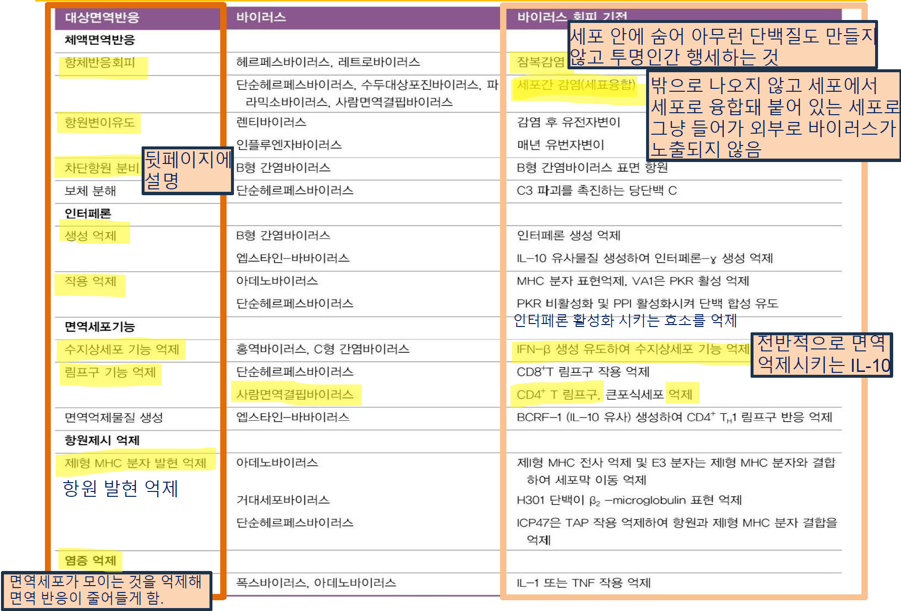 암기 : 체인면원염(체액성, 인터페론, 면역세포 기능, 항원제시, 염증) 억제한다. 1-항체 반응 회피(헤르페스, 레트로처럼 쏙 숨어서 잠복감염)하거나 항원변이, 차단항원로 항체 소모시킨다. 2-생성(HBV, EBV는 IFN-gamma 억제)과 작용(adeno, HSV)을 모두 억제한다 3-DC, L(HSV는 CD8+ T Lymphocyte 작용을 억제하고 HIV는 CD4+ T lymphocyte와 macrophage를 억제한다.) 기능 억제하거나 면역억제물질을 생성한다.. 4-MHC class 1이 하는 거다. 5-염증은 IL-1, TNF로 개시되므로 이걸 막으면 된다.