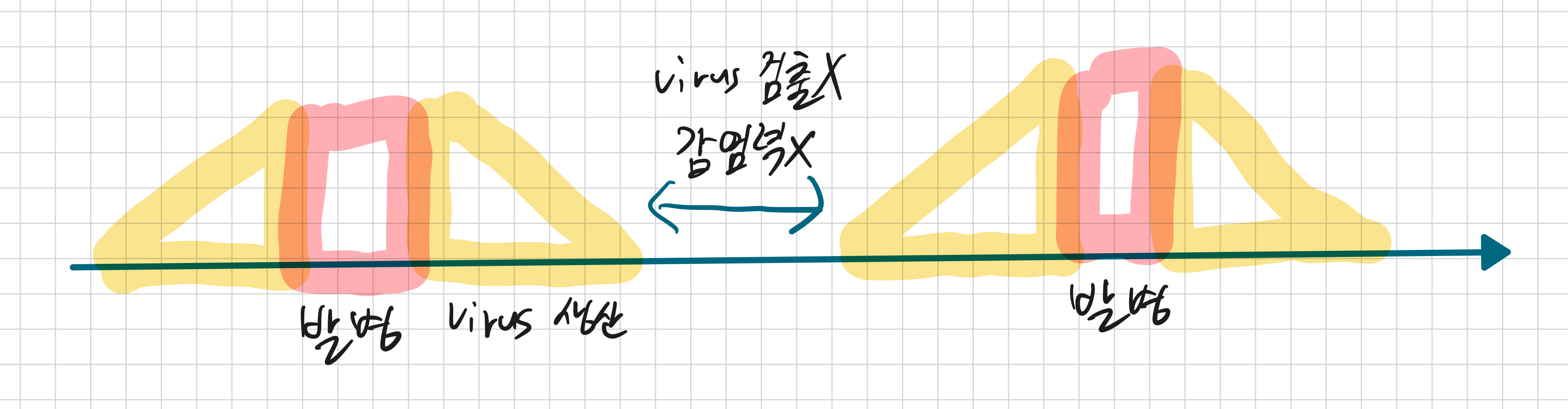 - 단핵구증, A형/B형 간염, 광견병, 유두종(사마귀), 사람면역결핍바이러스(후천면역결핍증)은 잠복기가 1달 이상이다. 특히 HIV는 잠복기 1~10년