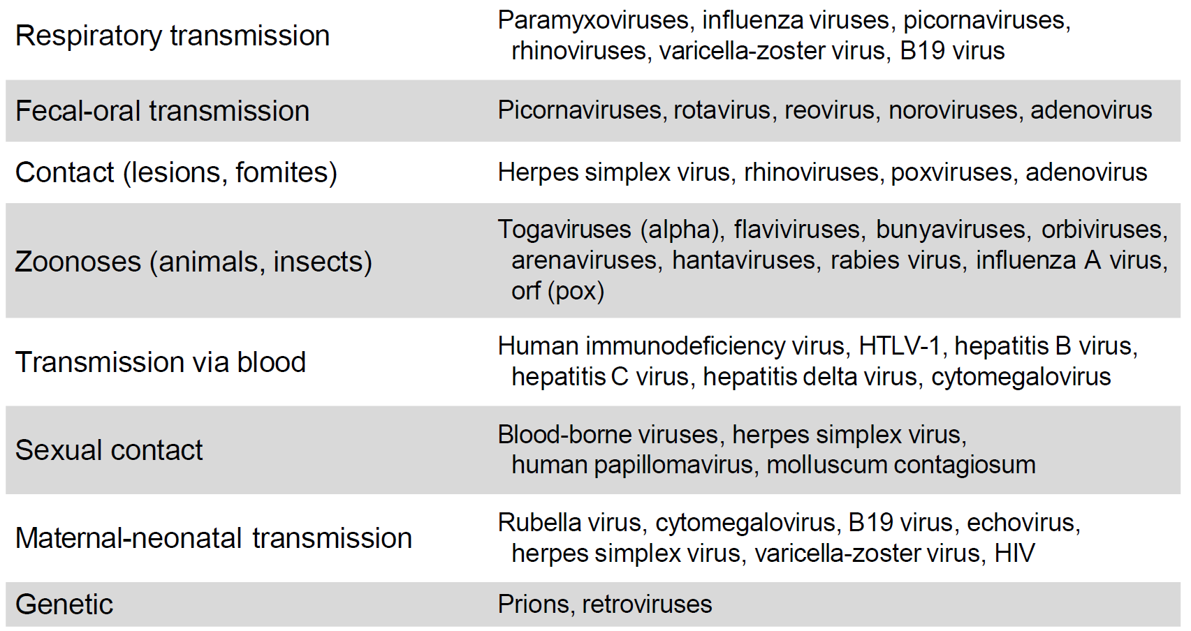 anthropods, animals : togaviridae, flaviviridae, bunyaviridae는 새나 동물 숙주(reservoir)에서 모기, 진드기 등 매개체(vector)로 전달되고 사람에게 감염된다. arena, hanta, rhabdo는 감염동물의 침, 대소변으로 감염되거나 개한테 물려서 감염되기도 한다.