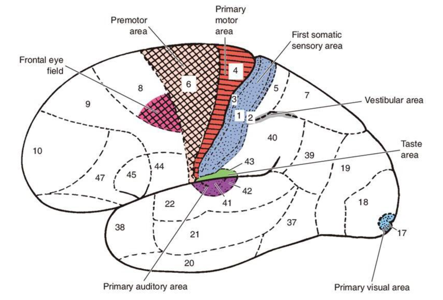 - 운동 : primary motor area는 central sulcus에서 앞쪽으로 4고, 그 앞으로 premotor과 supplementary motor는 6이다. (앞으로 4 / 6)