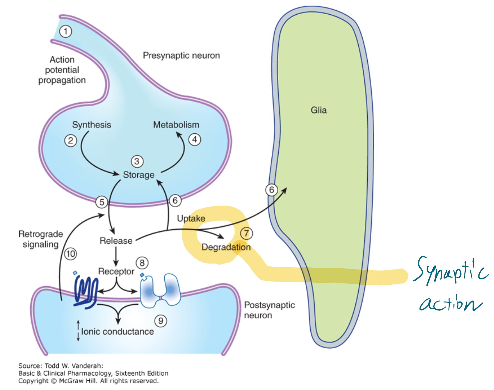 1. 시냅스 전 작용 : 위 그림에서 5번 과정까지 영향을 준다. AP 전파, 합성, 저장(reserpine-monoamine 저해), 대사, release(amphetamine-catecholamine 증가 / capsicin-subP 증가)