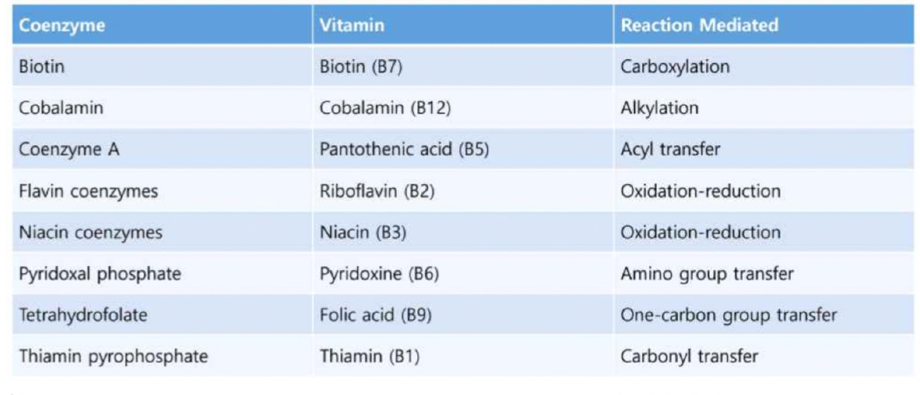암기 : 칼을 바칠 / 12마리의 코알라가 / 리투아니아의 산을 건너 / 앞이 안 보이는 육지를 뚫고 왔다. ~> 칼바칠(carboxylation, 바이오틴, B7), 12코알라(B12, 코발라민, alkylation), 리투아니아 산(리보플라빈, B투, 산화환원), 아피육(아미노기 전이, 피리독신, B육)