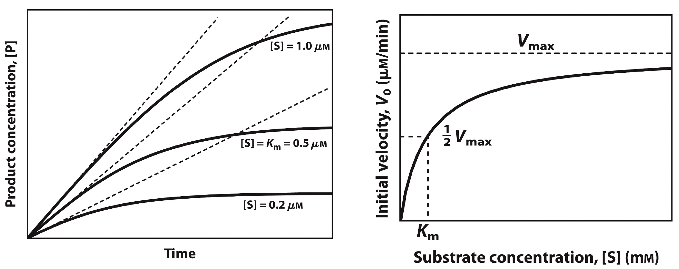 - 반응물 농도 [S]가 높으면 초기 반응 속도가 빠르다. 단 이 속도는 V_max를 넘지 않는다.
