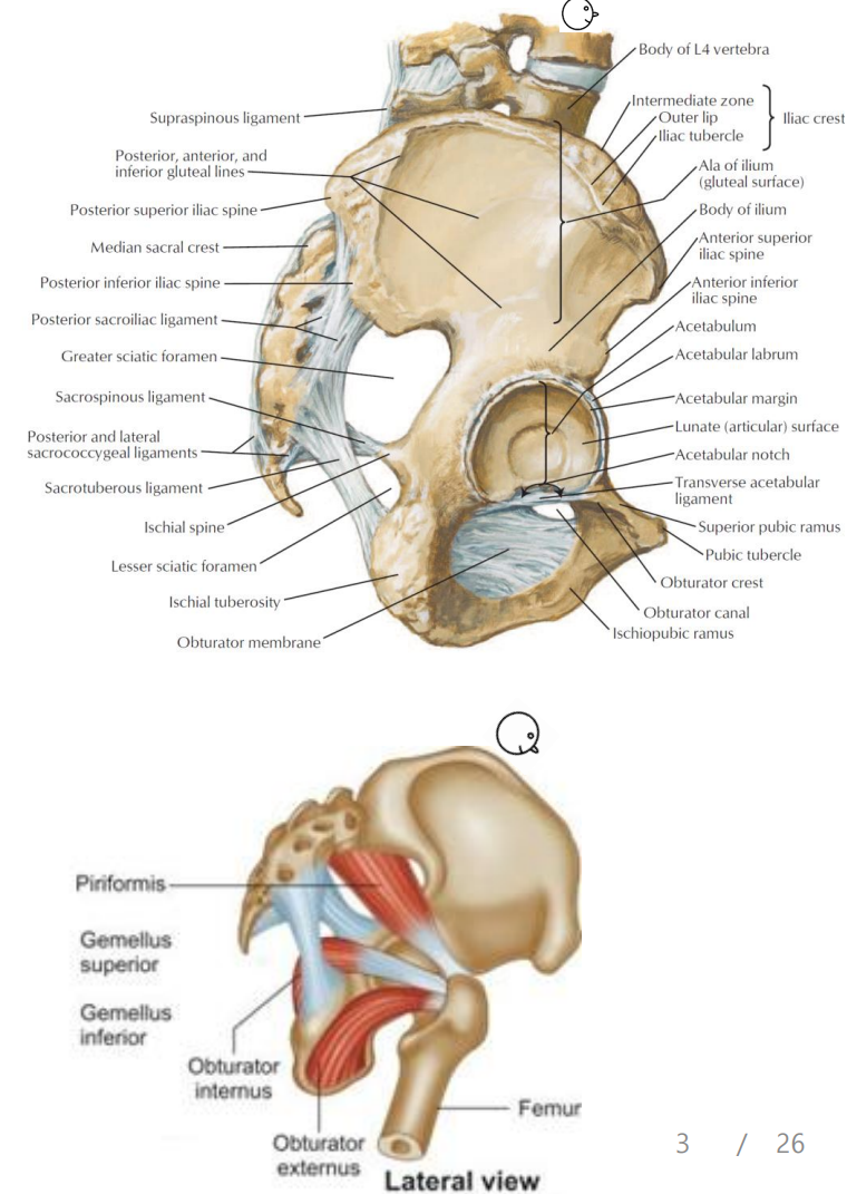 - sacrum에서 ischial spine, ischial tuberosity로 각각 sacro/spinous ligament, sacro/tuberous ligament가 붙는다. 각각 greater sciatic foramen과 lesser schiatic foramen을 이룬다. 두 구멍은 아래를 내려다보는 방향으로 내려가며, 여기를 통과하는 구조물이 아주 많다.